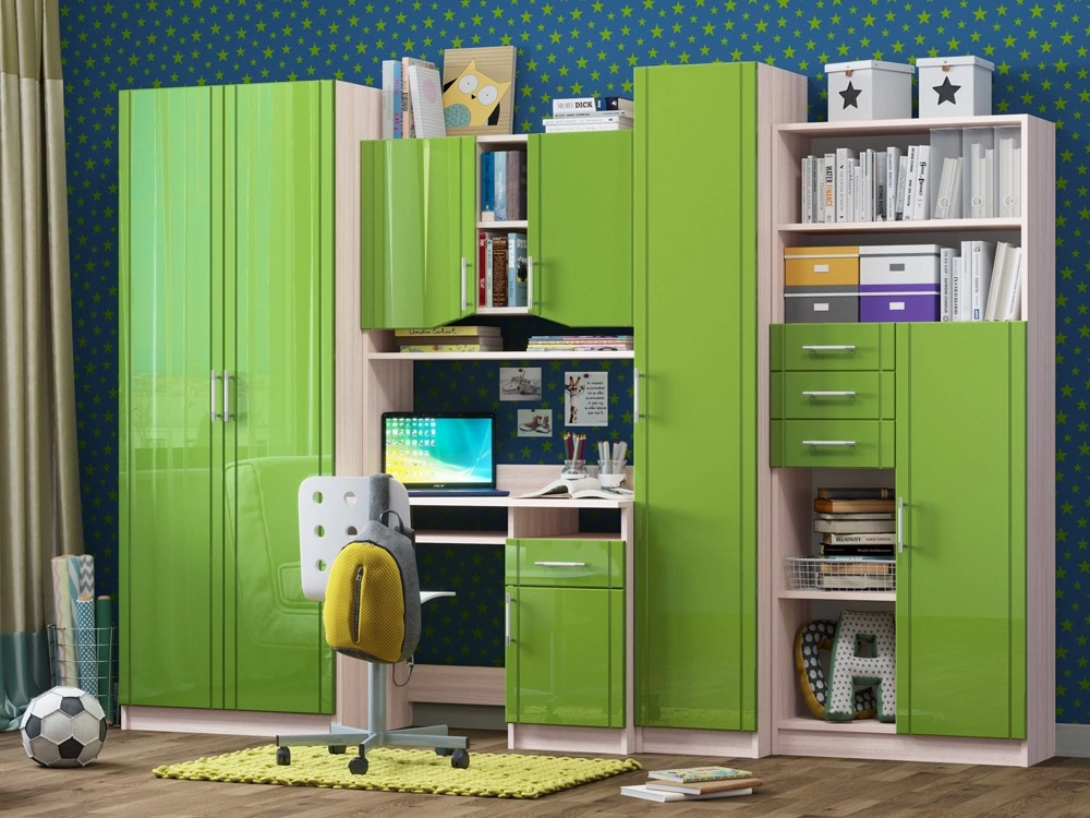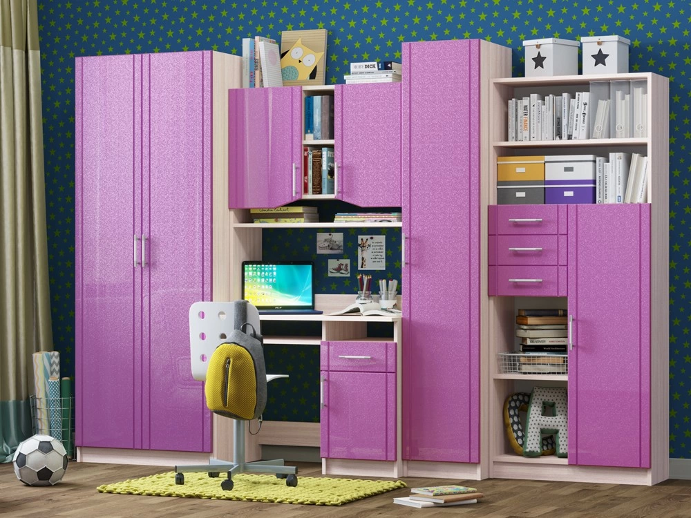 Детская Юниор МДФ – практичный и экономный вариант. Подойдет, как и для подростка, так и для маленьких хозяев комнаты. Вместительные отделения шкафа и большое количество ящиков помогут поддерживать порядок в комнате. Внутри шкаф оснащен штангой для плечиков и огромным количеством полок, что позволит поместить большое количество одежды.