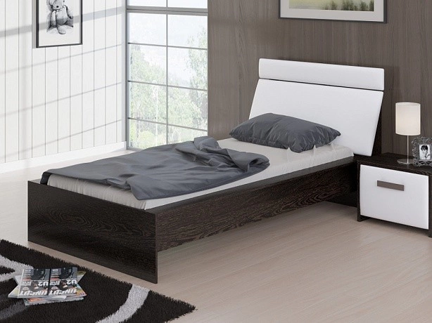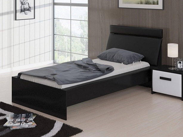Стильная черно-белая кровать с наклонной спинкой. С обратной стороны спинка усилена ребрами жесткости. Каркас кровати выполнен из ЛДСП, а мягкая вставка на изголовье обита экокожей класса "Люкс".