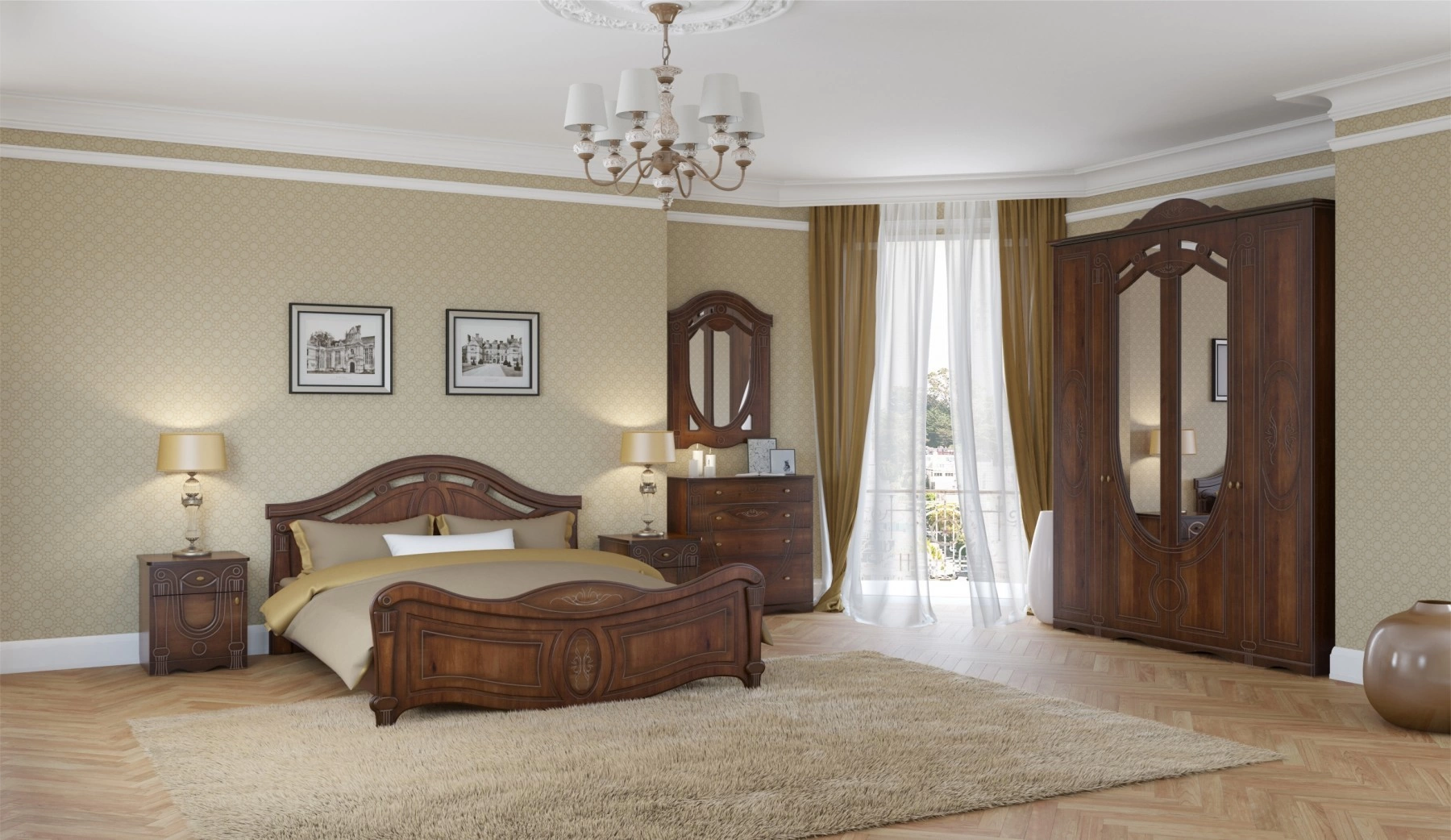 Спальня "Александрина" создаст самый уютный уголок в Вашем доме. Классический дизайн с патинированными фасадами и фасадами цвета орех подчеркнут изысканность интерьера. Основание кровати из стального каркаса обеспечит надежность и удобство на долгие годы. В такой обстановке приятно провести время!