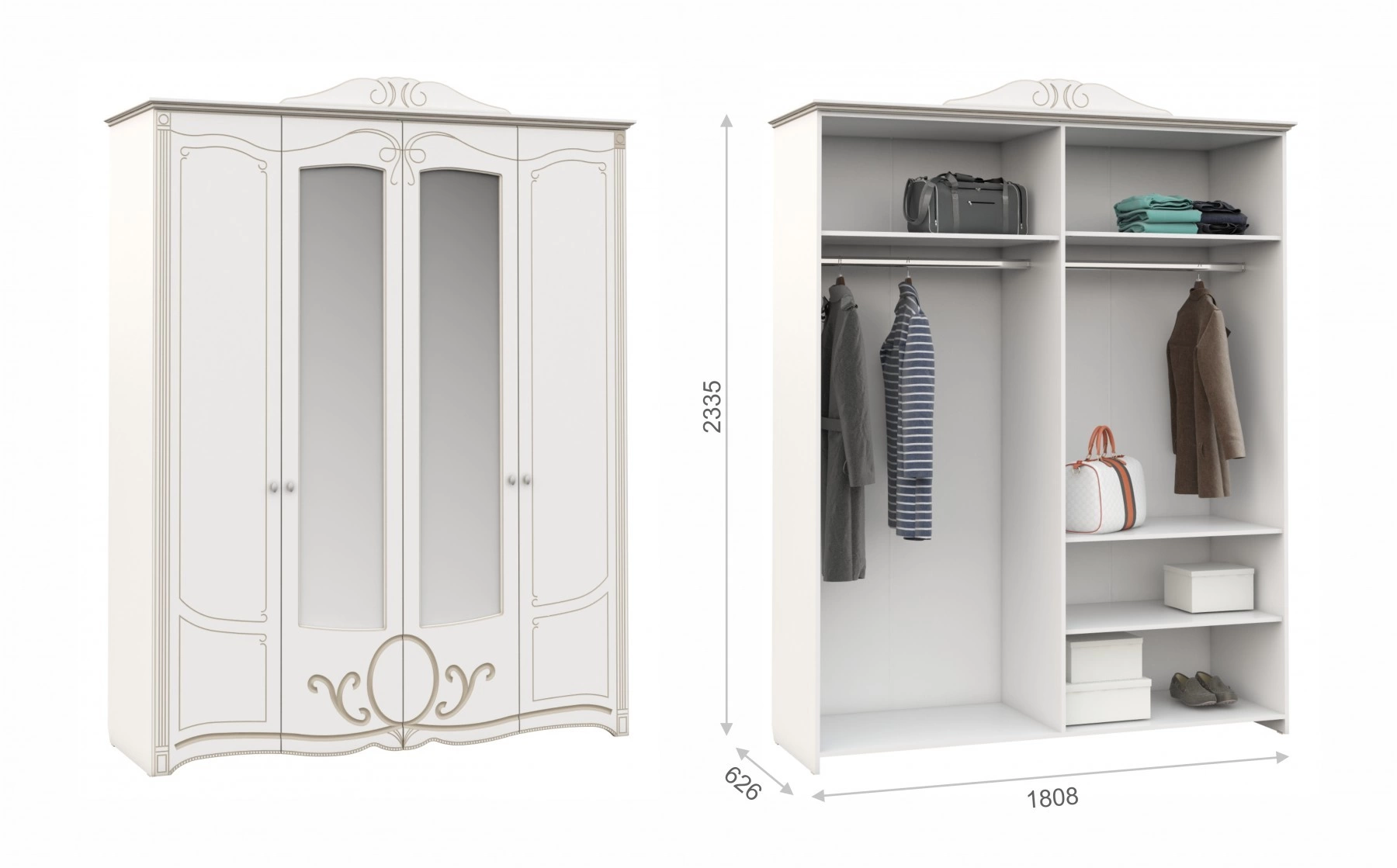 - Шкаф 4-х Створчатый: Ширина 1808 мм х Глубина 626 мм x Высота 2335 мм