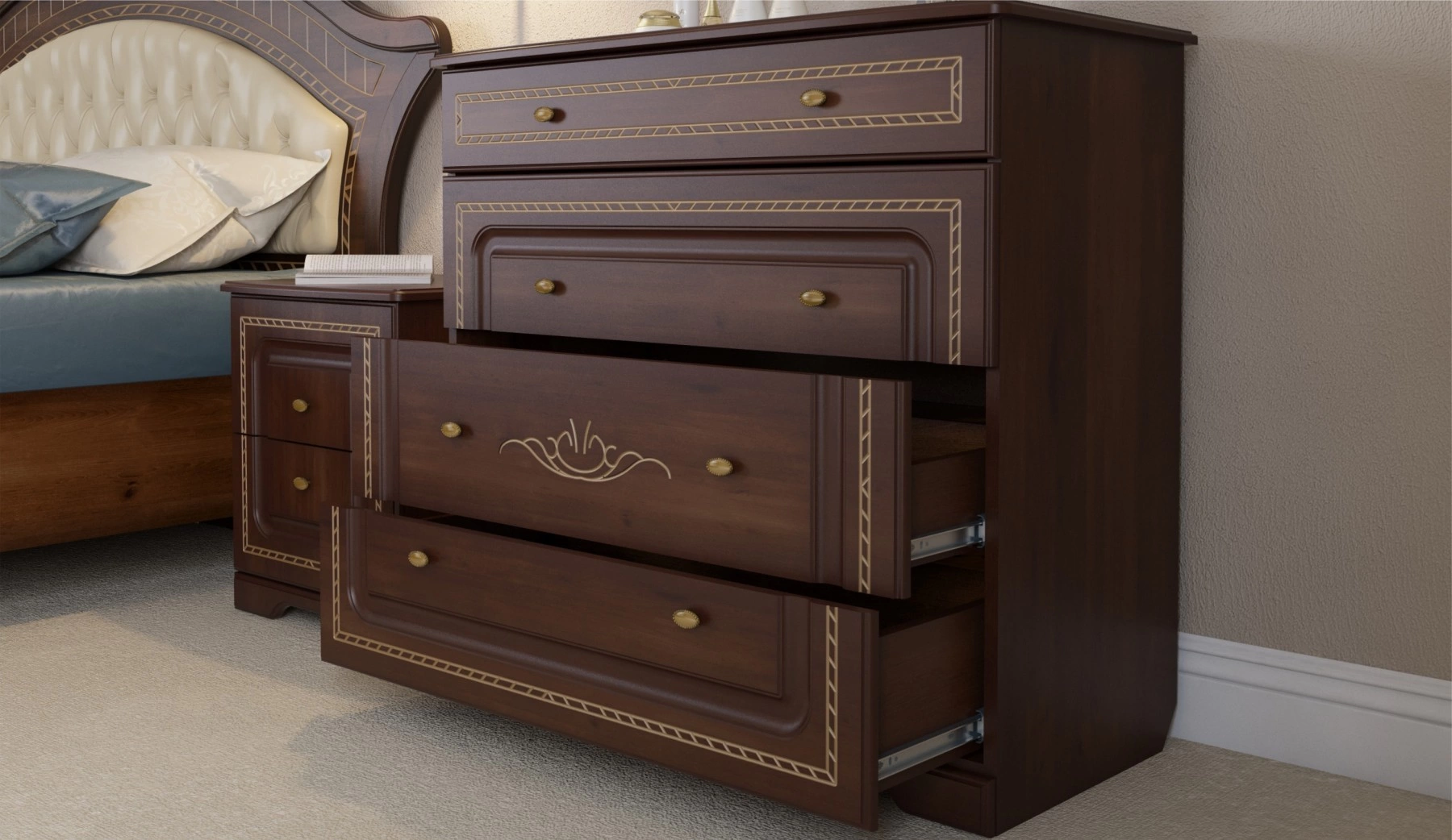 Фасады спальни "Диана", покрытые лаками, красками и патиной ручной работы - это настоящий шедевр, проверенный временем в Европе и дошедший до наших дней. Технология производства фасадов является разработкой итальянских мастеров 19-го века. Фасады точно передают внешний вид и текстуру натурального дерева. Основой фасада служит экологически чистый МДФ, покрытый патиной ручной работы для получения знаменитого в традиционной классике эффекта старения!