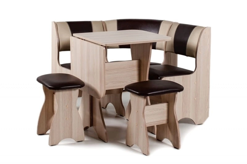 Особенности уголка: С этим набором Вы легко организуете обеденную зону даже в самом небольшом пространстве. Диван имеет два вместительных ящика для хранения различных вещей. Столешница покрыта термостойким пластиком. Влагостойкие ножки. Размеры: Размер угловой скамьи: ш(1000х1000)хг500хв850 мм. Размер стола: ш625(1000)хг580хв750 мм. Размер табурета: ш380хг290хв460 мм. Уголок универсален - собирается как в левом, так и в правом исполнении.