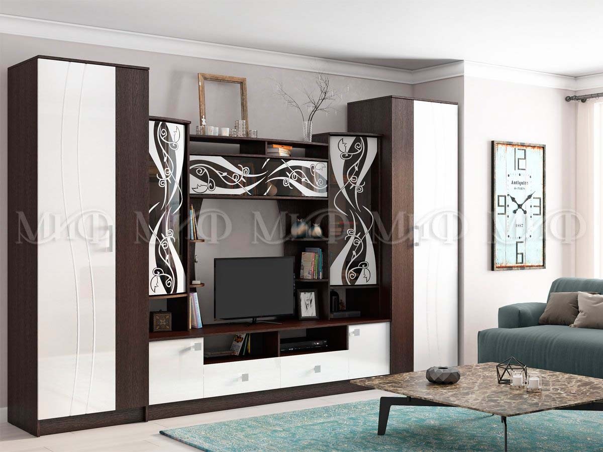 Белая гостиная из мдф. Яркое решение для гостиной комнаты. Стеклянные дверцы верхних фасадов за счет их декорирования матовым рисунком, выглядят стильно и практично. Гостиные со стеклом - хорошая возможность создать уникальный интерьер.